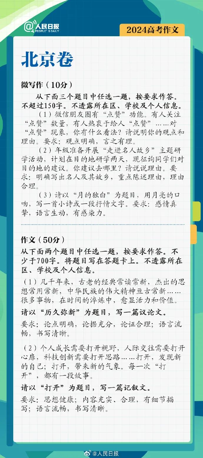6 月 7 日,2024 年中国高考正式开考,2024 年高考语文作文试题共 6 道,即:全国甲卷、新课标I卷、新课标II卷,以及北京卷、天津卷、上海卷。