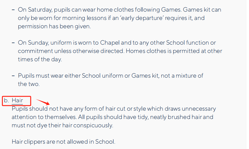 细则校规里,有关于上课考勤、自行车使用、着装与外表、饮食、电邮礼仪、当地规则、手机耳机使用、恋爱,还有关于守时、关于外出的规则,甚至还有关于家长、酒精、派对的指导说明。在着装与外表的部分,包括学生日常制服的使用、学生发型、关于珠宝、化妆、纹身等具体事项都做了对应要求。