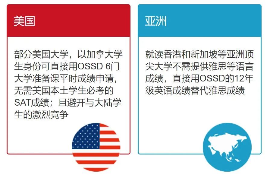 目前,美国、英国、加拿大、澳大利亚等国家,及中国香港地区接受高考成绩+语言成绩申请的大学数量有限,如果目标院校不接受高考成绩,可以转轨到OSSD课程,用OSSD成绩进行申请。