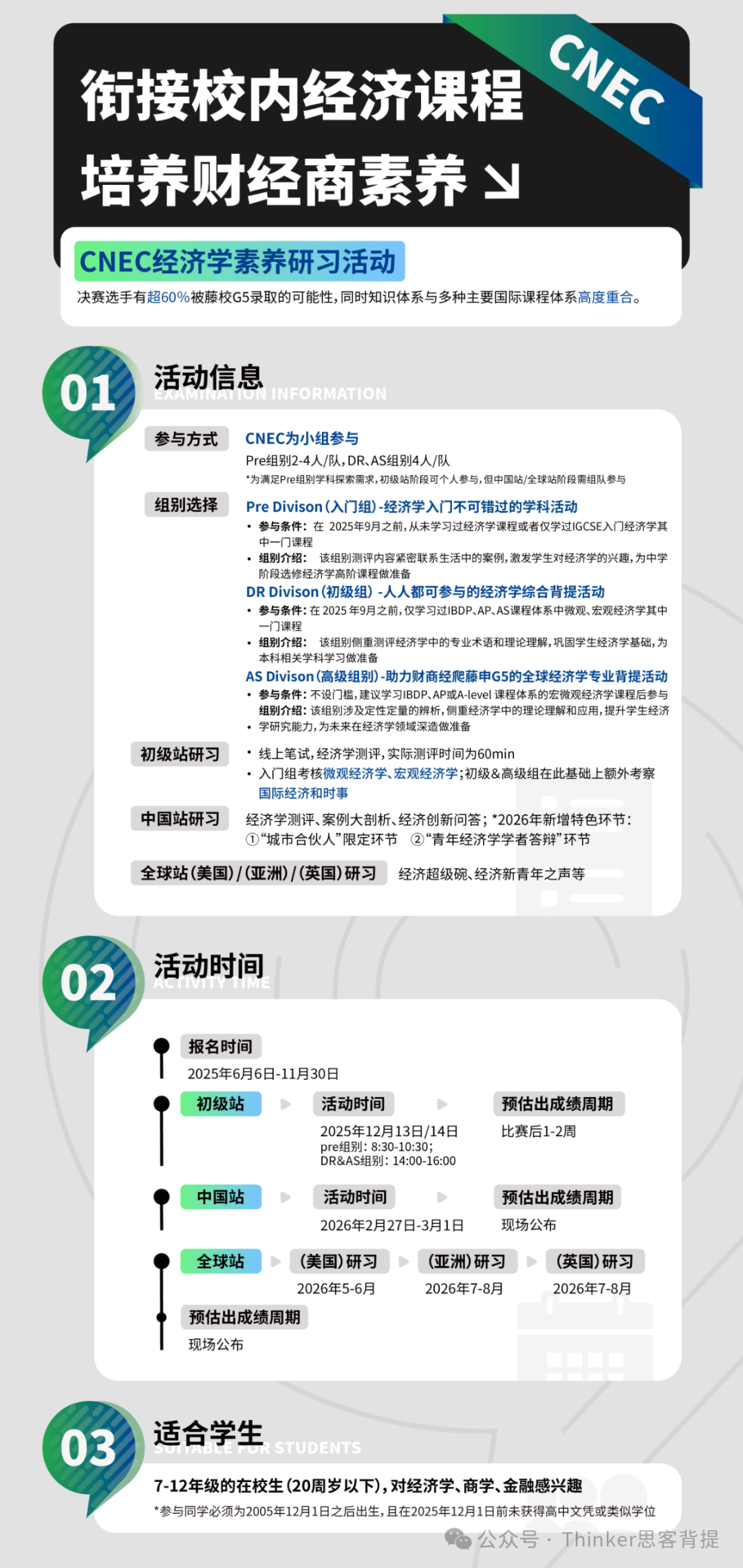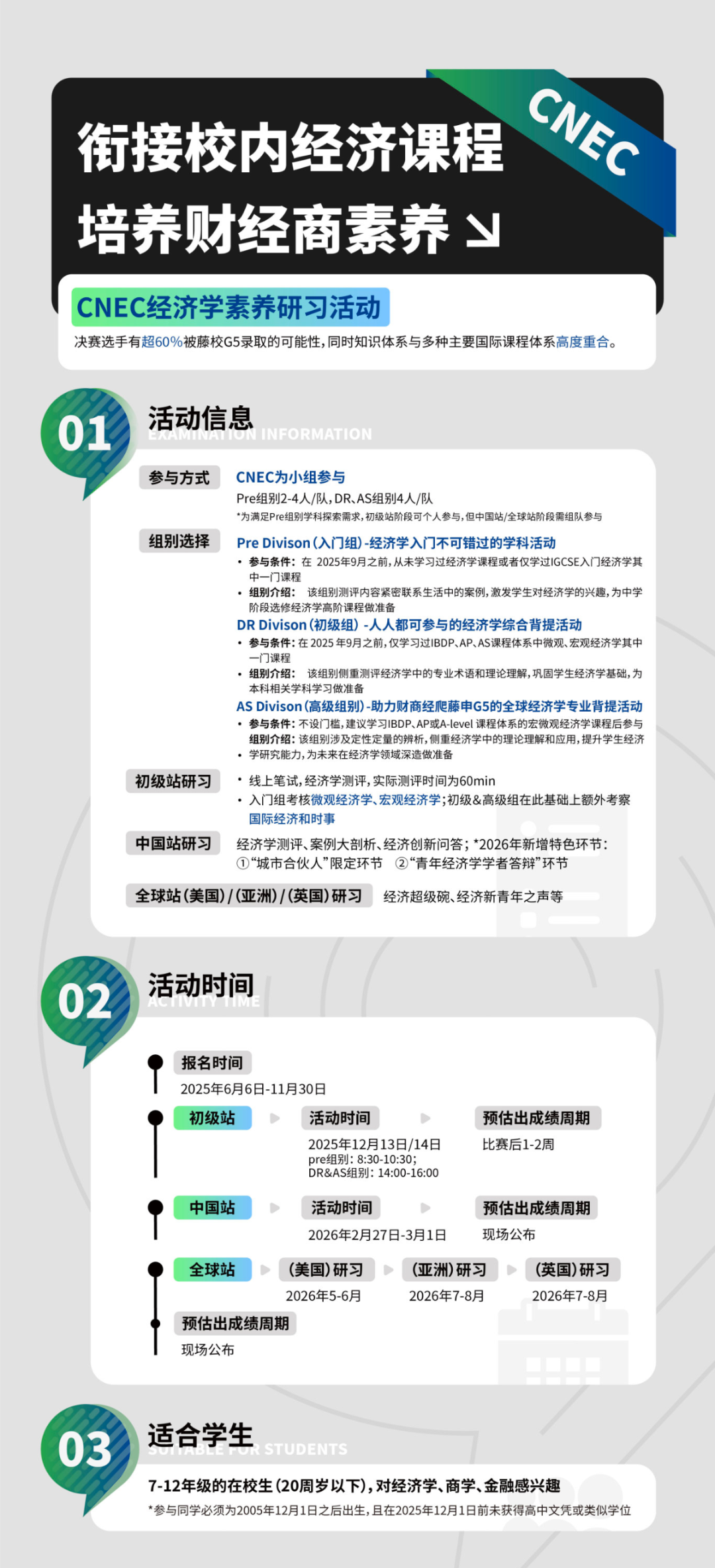 NEC(National Economics Challenge)全美经济学挑战赛,由美国经济教育学会CEE主办,面向全球7-12年级中学生,活动以考察经济学学术知识掌握能力为主,多年来深受中国学生欢迎,适合对经济、管理、商科、社科感兴趣的中学生参加。比赛主要考察经济学知识,包括宏观/微观经济学和国际经济学。NEC中国赛区叫做CNEC经济素养研习活动,计划参赛的学生可以直接在Bloom官网进行报名(www.webloom.cn/bloom_web/#/)。