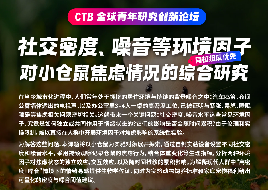课题含金量:项目为理解现代城市生活中的心理健康挑战提供了独特的生物学视角,该课题巧妙连接了动物行为学与人类心理健康,既为实验动物福利提供量化依据,又为城市环境规划提出科学建议,完美契合顶尖院校对跨学科研究和社会问题解决能力的重视。其创新性方法论和实际应用价值,使其成为申请生物、心理或环境科学方向的强有力支撑项目,尤其适合通过国际科研竞赛或政策倡导等途径凸显申请者的学术潜力与社会责任感。