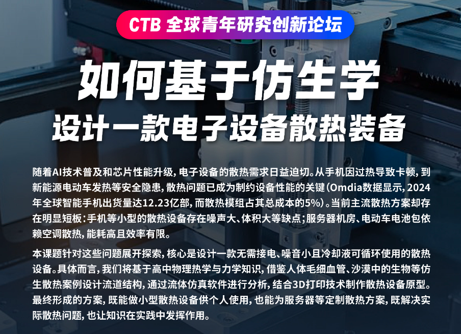课题含金量:这一课题通过仿生学设计电子散热装备,将自然智慧转化为创新工程方案,直击AI时代设备过热的全球性挑战。其核心价值在于以跨学科思维(生物+工程+物理)提出无源散热技术,既能降低手机、电动车等设备的能耗,又能展现扎实的科研落地能力。该课题完美契合名校对“自然灵感-技术创新-社会影响”闭环的期待,不仅帮助申请者在竞赛中脱颖而出,更以可专利化的模块化设计和碳中和关联性,塑造“解决未来问题的工程师”这一独特申请形象,有效突破STEM同质化竞争。