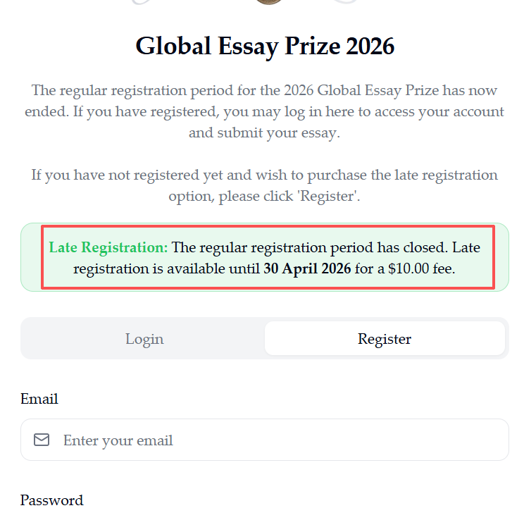 2026JohnLocke竞赛常规注册已经截止,今年新增延迟报名:缴纳10美元,并在2026年4月1日—4月30日期间完成注册,即可获得参赛资格。机构推出冲刺6小时速通1V1辅导,针对已经注册并完成初稿的同学提供冲刺辅导,修改润色查重一站式服务!助力学生高质量完成作品!