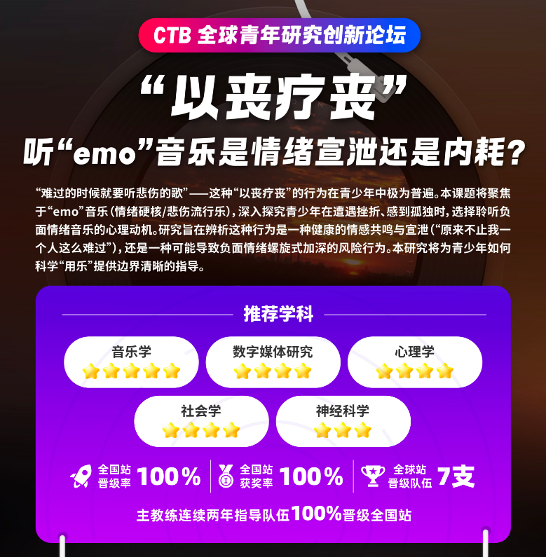 CTB全球青年研究创新论坛是一项可以DIY课题的跨学科活动,由哈佛、清华联合发起,是国际生申请藤校、G5、港前三的高含金量学术背书。赛事评审由名校教授主导,成果可获权威推荐信与论文发表机会,帮助国际生打造差异化申请优势。