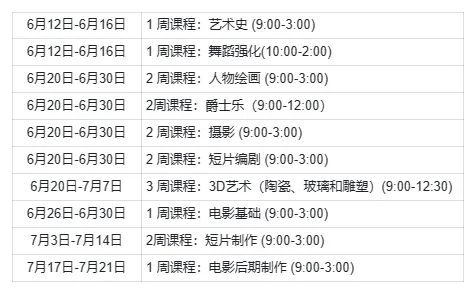 艺术营课程包含:艺术史、舞蹈、绘画、音乐、摄影、编剧、陶瓷、雕塑、玻璃、电影、短片制作、电影后期制作。有一周课程和两周课程可供选择,每个课程仅开设一期。